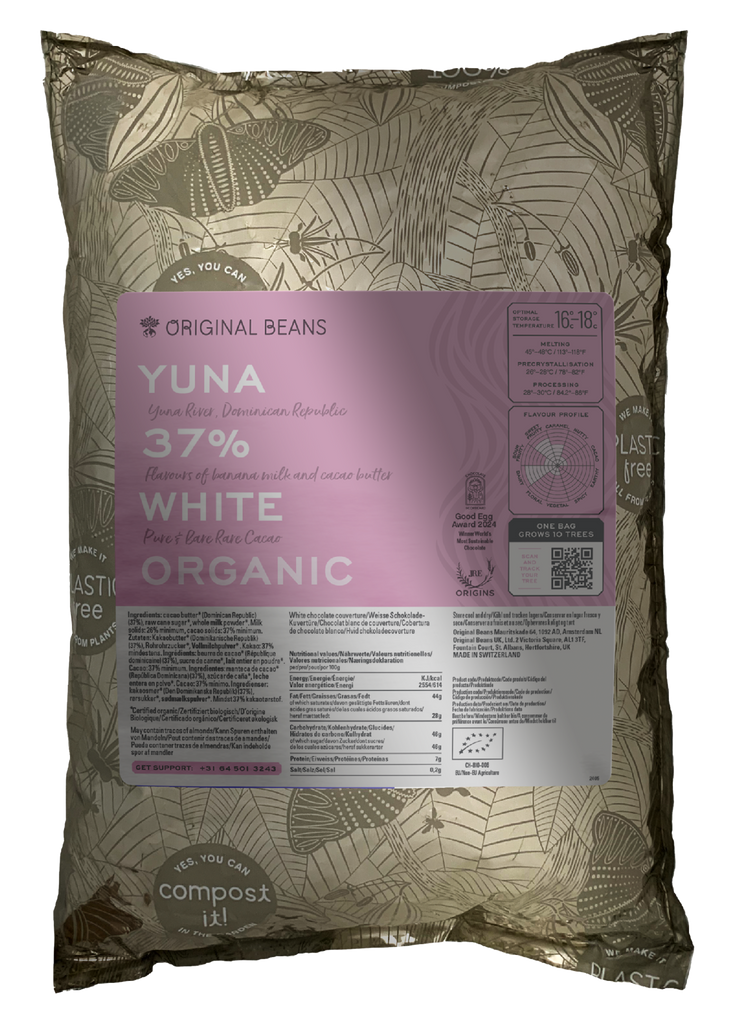 Flavours of banana milk and cacao butter slowly mix smoothly with secondary notes of cream, caramel, grass and nuts. This pure white chocolate is additive free and contains no lecithin and no vanilla.